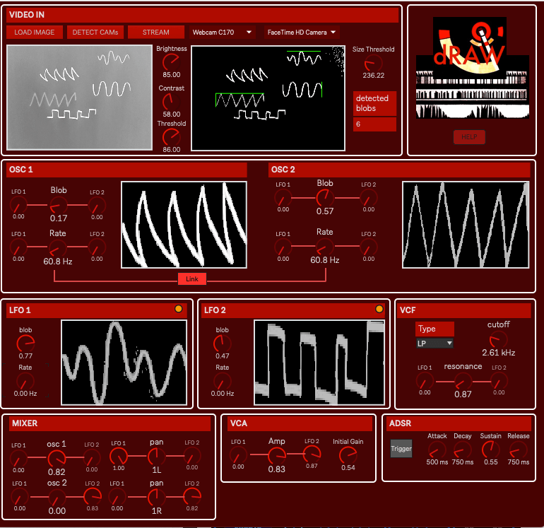 The source waveforms used in its oscillators and LFOs are grabbed from an uploaded image or a camera stream. This allows you – for instance – to sketch shapes on a piece of paper and then scan them for being used in the synthesis process.